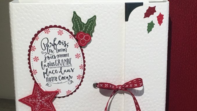 Vous aurez la possibilité de choisir une couverture blanche ou une couverture rouge au moment de votre inscription. À l’intérieur de nombreuses surprises vous attendent. Nous avons travaillé les collections de papier « Soyons joyeux » et « Noël matelassé ».