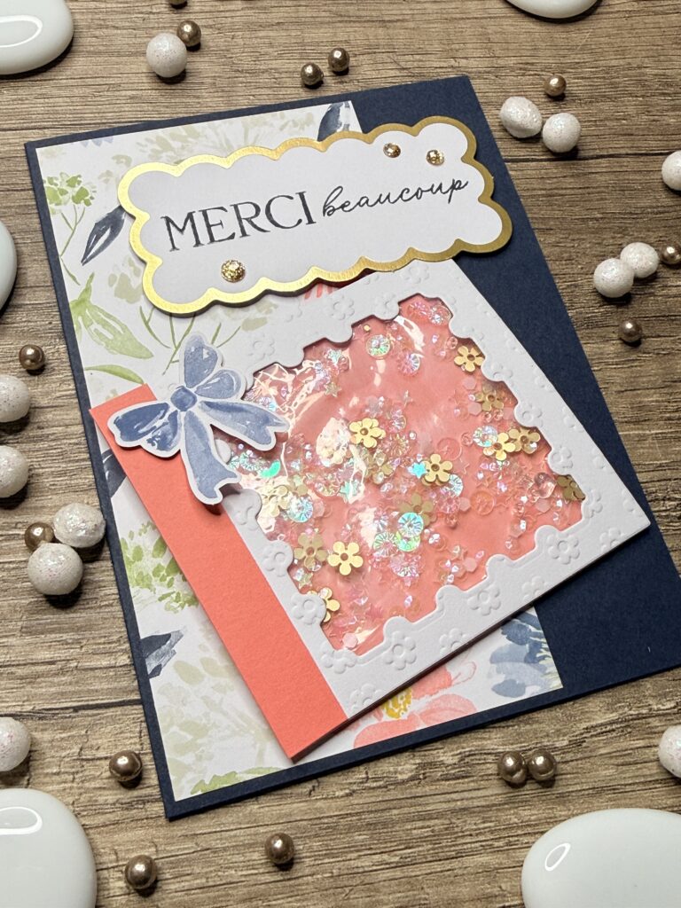Et bien sûr, une shaker card, pleine de lumière et de mouvement, avec ces petits éléments à secouer que l’on aime tant