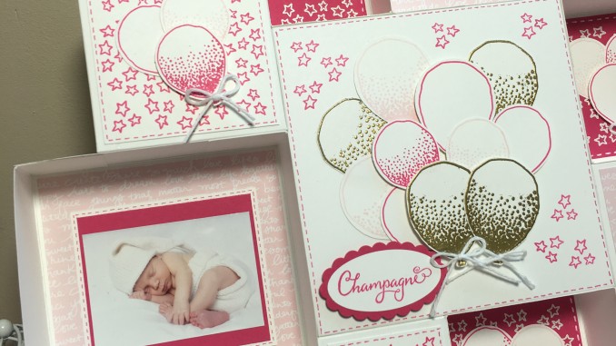 Ça fait 2 fois que je vous dis la même chose mais promis je vais aussi travailler pour les petits mecs qui ne tarderont pas à pointer le bout de leur nez. Aujourd’hui place encore une fois à 2 de mes couleurs fétiches, « Petite Pirouette » et « Melon Mambo ». Vous pouvez apercevoir une feuille du bloc de papier de série Design Subtil, ce papier existe dans toutes nos couleurs. Après ça je me suis amusée avec les étoiles du set de tampons et enfin avec les ballons puisque , pour moi, qui veut dire set de tampons « Balloon Célébration », veut dire envolée de ballons, des ballons « petite pirouette », d’autres « melon mambo » et les derniers embossés à chaud avec notre poudre Or