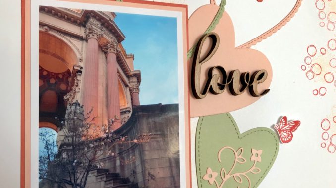 De mon coté, j’ai travaillé les couleurs « corail calypso » et « pétale rose » sur les bordures en tamponnages. J’ai aussi fait s’entrelacer plusieurs découpes. Un petit papillon tamponné puis découpé est venu se poser sur un des coeurs. J’ai terminé par une découpe laser en bois mais ne me demandez pas où vous pouvez vous la procurer, c’est ma puce qui me l’a créée (j’en ai quelques unes en réserve que je mettrai par ci par là dans mes prochains projets hihiii)