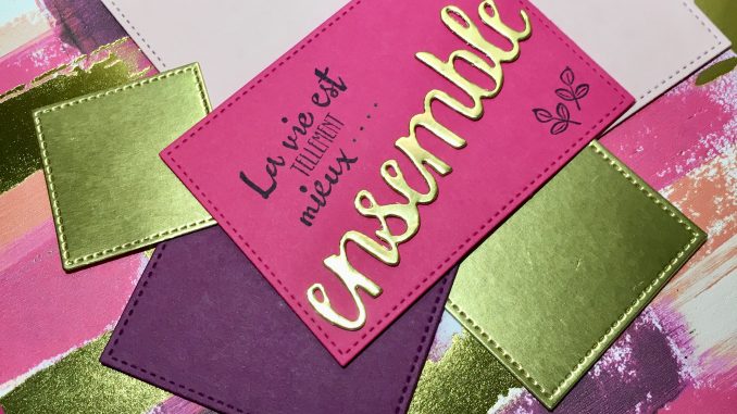Les consignes pour cette fois ci c’est de vous faire rêver autour du thème de la Saint Valentin et pour ma part je trouve qu’on a une collection de papiers qui se prête très bien à l’exercice dans le catalogue printemps-été que vous avez découvert il y a quelques toutes petites semaines maintenant, je vous fait languir, il s’agit de la collection « Peint avec amour », un dégradé de roses, de l’or comme ci il avait été embossé