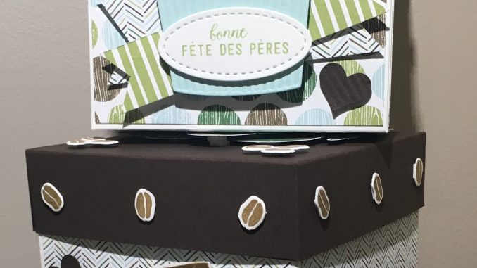 Les consignes pour cette fois ci étaient toujours aussi simple mais Aude en a profité pour me mettre au défit. Il s’agissait cette fois de réaliser une boite. Et bien j’en ai réalisé 6. Je ne sais pas si vous vous souvenez mais pour la fêté des mères, la belle mère de ma collègue m’avait demandé si je pouvais faire un petit quelque chose aux mamans des enfants qu’elle accueille. Elle a tellement aimé et comme elle n’a pas voulu faire de jaloux, elle m’a demandé de faire un autre petit quelque chose pour les papas. Beaucoup moins évident mais je me suis tournée vers notre collection pause café et je me suis dit que je pourrais réaliser des boites pour leur offrir un mug