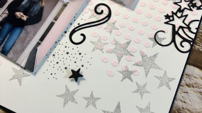 Je vais essayer de vous en dire un peu plus. J’ai commencé par tamponner des étoiles avec l’encre métallisée argent et j’ai ensuite colorer de la pate à structure en rose clair pour tenter de me rapprocher de la couleur des photos pour faire des points grâce à mon pochoir. J’ai ensuite rajouté quelques micro étoiles tamponnées en noir