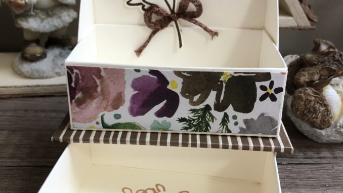Evidemment je ne voulais pas faire un petit truc vite fait, je voulais quand même que ce tout petit cadeau soit à la hauteur alors j’ai creusé un peu dans ma petite tète et j’ai fais un projet mi cartonnage avec cette série de papier d’automne que j’aime tant. J’ai ajouté un tiroir pour pouvoir y laisser des petits annotations importantes par exemple récoltées au moment de la distribution des cartes. Apres je pense qu’il serait assez facile de le détourner pour une autre utilisation