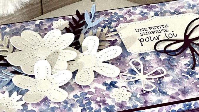 J’ai fait la décoration avec le papier de la collection « colline d’hortensias » et les poinçons « efflorescence brodées » et « bouquet emballé »