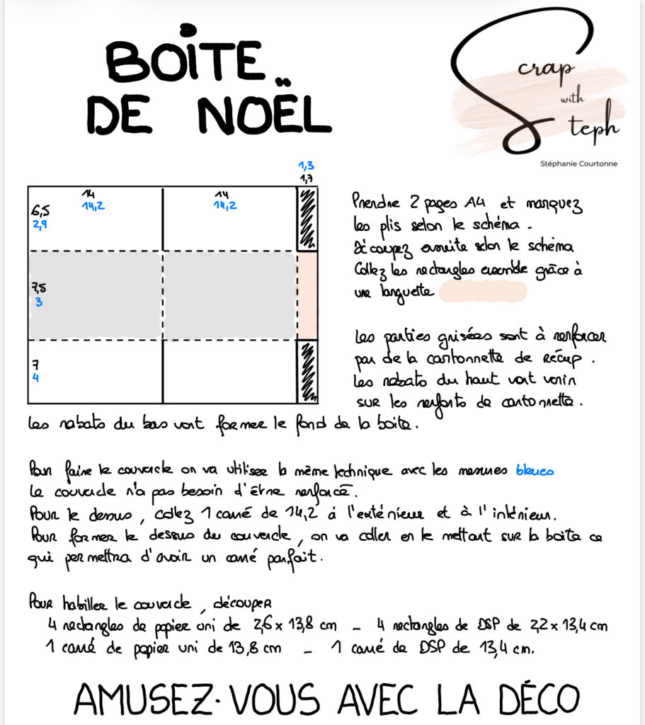 C’est ma façon de vous dire merci, et de vous permettre, vous aussi, de créer cette boîte sur mesure, à adapter selon vos envies, vos contenants ou vos couleurs de Noël. Si votre contenant a une taille différente, vous pouvez modifier les différentes mesures pour vous adapter.