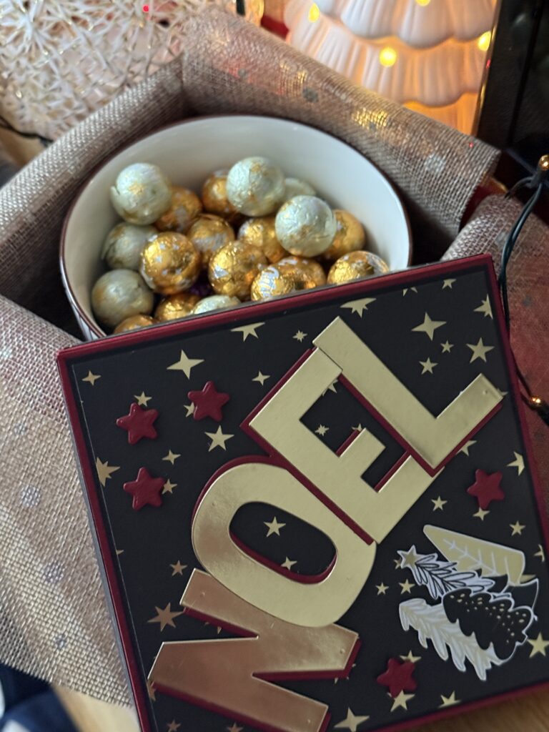 Je l’ai remplie de chocolats emballés dans du papier doré, afin de rappeler les étoiles et les touches or du papier imprimé.