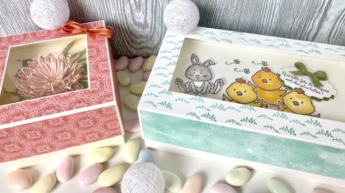 Vous vous souvenez de la boite vitrine carrée avec la jolie fleur que je vous ai présentée ici, voilà aujourd’hui une version rectangulaire avec un décor de Pâques