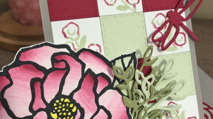 Le principe de la carte sur damier couture de Couleur papier que j’ai légèrement revisité car je voulais des tout petits damiers. J’ai associé 3 couleurs et sur les carrés blancs, j’ai fait du tamponnage à 2 couleurs