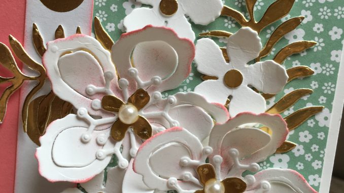 L’or je l’ai trouvĂ© dans nos feuilles mĂ©tallisĂ©es que j’ai dĂ©coupĂ© Ă la big shot mais aussi dans les feuilles or des papiers de la sĂ©rie design « Touche de rose » du nouveau catalogue