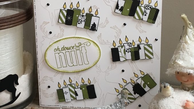 Sur ce modèle , j’ai tamponné en fond les petites flammes une à une pour que ça reste léger. J’ai découpé une bande de papier de la série design « Jolies fêtes » que j’ai bordée d’un feston obtenu grâce à la perforatrice « Bordure de ruban décoratif », j’ai ensuite placé une étiquette « Oh douce nuit » que j’ai tamponnée en noir et remplie en rouge. J’ai enfin placé des bougies que j’ai elles aussi tamponnées en noir et remplies en « rouge rouge » et « vert olive » puisque le remplissage se fait grâce à 2 tampons