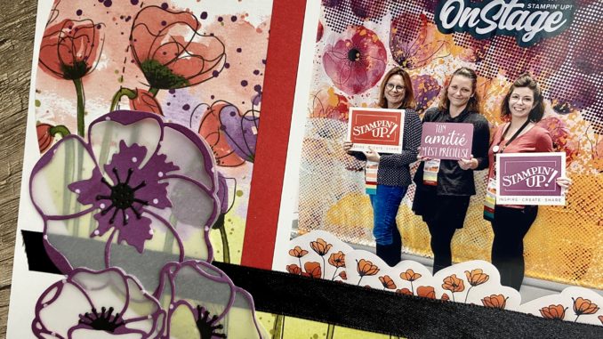 Pour la petite histoire, chez Stampin’Up, chaque année au mois d’avril, on a notre convention, un super moment de partage avec le staff et avec les copines. Cette année, à cause du confinement, cet évènement a été annulé alors on se remémore les souvenirs du dernier qui était un évènement exceptionnel sur 4 jours. Sur la photo, vous pouvez voir Sandrine et Sophie avec qui je suis partie mais il y avait évidemment Aude et bien d’autres scrap copines françaises et européennes ( même quelques internationales )