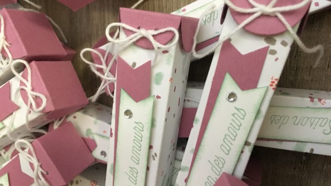 Il s’agit de petites boites longues qui contiennent des bonbons évidemment et qui se ferment grâce à une découpe que certains auront reconnue, il s’agit de la mini enveloppe du lot de poinçons framelits « mots d’amour »