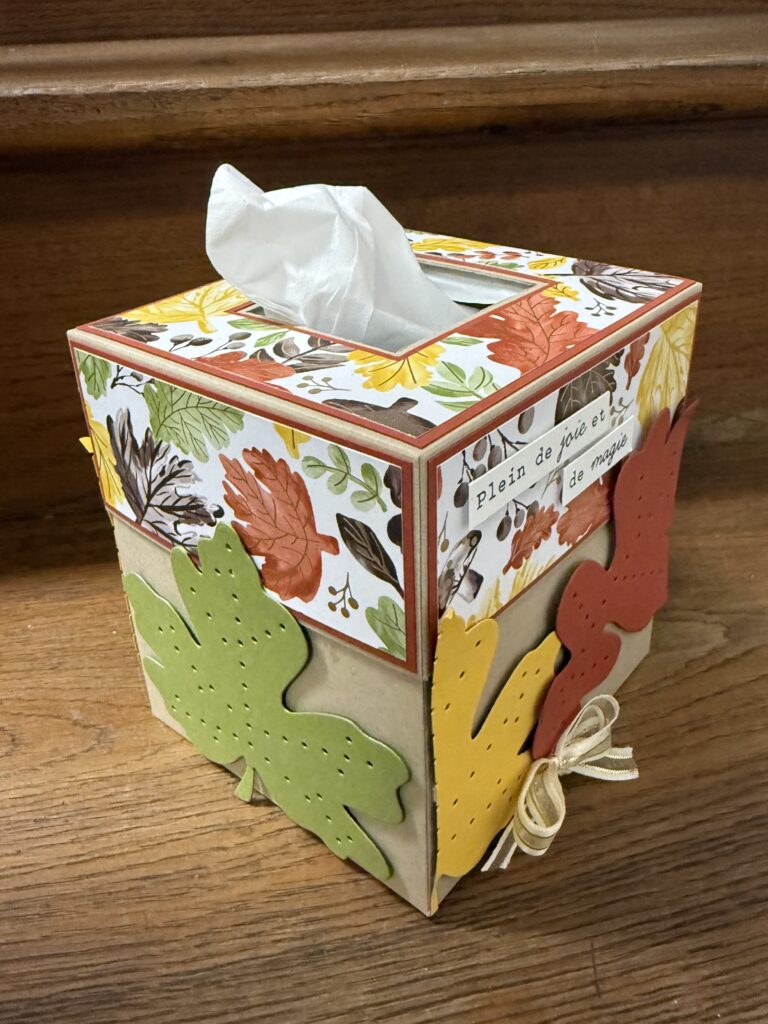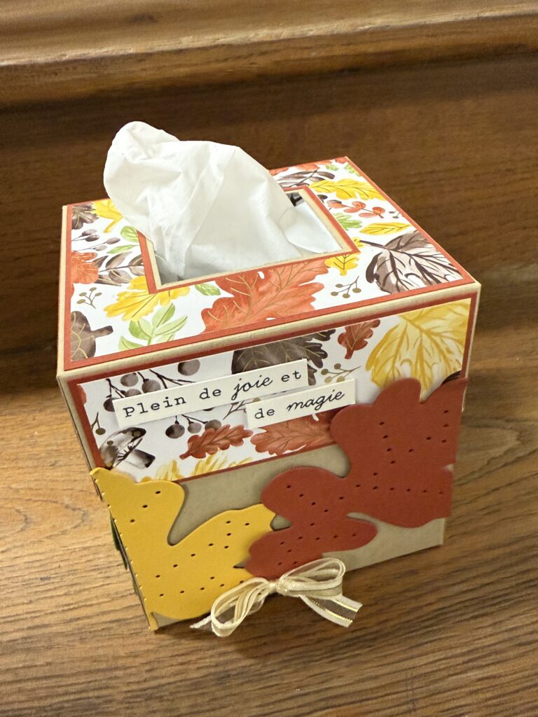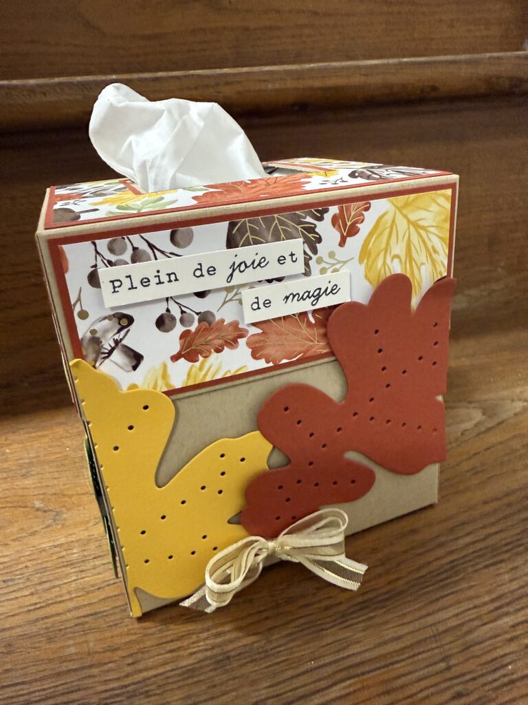 Pour cette boîte, j’ai choisi des teintes automnales : Cari moulu, Ocre roussillon, Vert olive, Couleur café et Brune dune. Les papiers imprimés apportent une ambiance chaleureuse et naturelle, tandis que les grandes feuilles découpées offrent du relief et du mouvement.