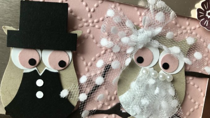 Pour la 1ere carte, j’ai eu des consignes assez précises, il s’agissait non pas d’un mariage mais d’un anniversaire de mariage et pas n’importe lequel, les 60 ans d’un mariage. C’est extraordinaire de pouvoir organiser une telle fête. Les autres consignes étaient de faire une carte carrée 15×15 et d’y mettre un couple de chouettes. La perfo chouette a malheureusement quitté notre catalogue il y a un petit moment mais je n’ai pas pu m’en séparer. Je me suis beaucoup amusé à créer ce petit couple de mariés. Monsieur en smoking avec son chapeau et madame toute en délicatesse avec cette robe en tulle à pois et ce joli voile sur la tête. Dans ce cas là, je ne regrette pas d’être conservatrice. J’ai aussi utilisé un petit alphabet qui lui est encore plus vieux Hihihiiiiiii