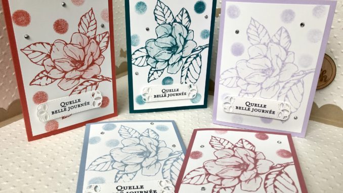 Je vous montre 5 cartes réalisées avec ces 5 couleurs et le tampon gros magnolia du set « Magnolia du matin » probablement un de mes préférés du catalogue