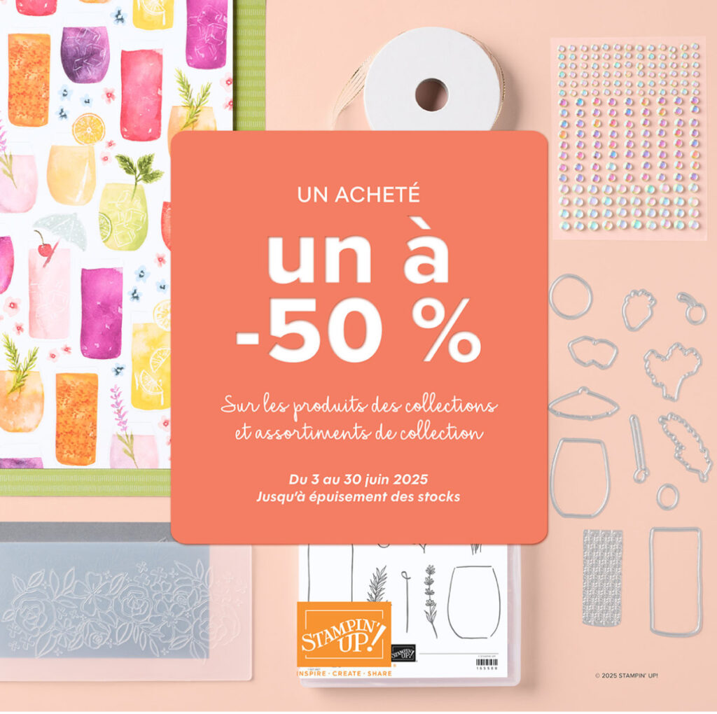 En parlant de plaisir… Actuellement, chez Stampin’ Up!, il y a une offre exceptionnelle : pour tout achat d’une collection ou d’un produit d’une collection, le deuxième est à -50% ! C’est le moment parfait pour compléter vos collections ou craquer sur vos coups de cœur.