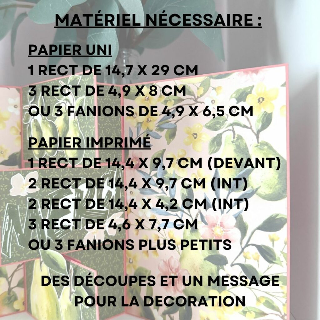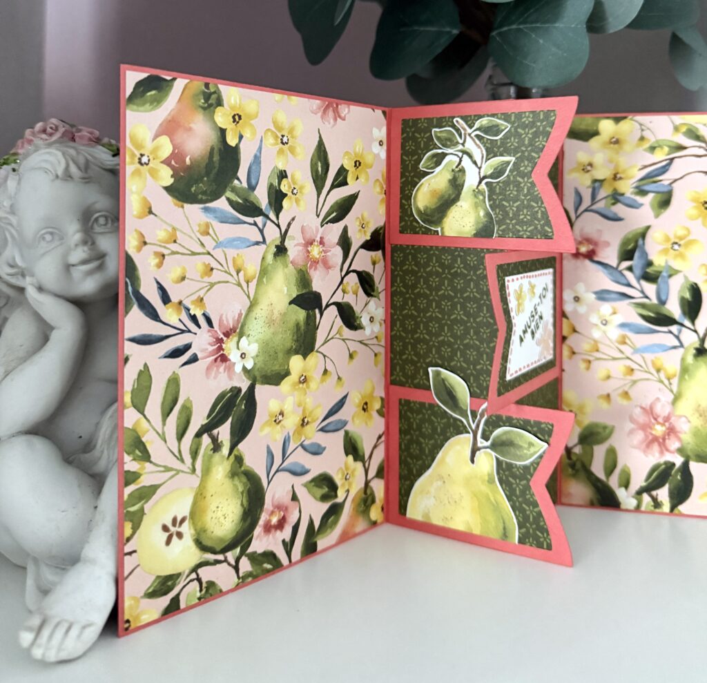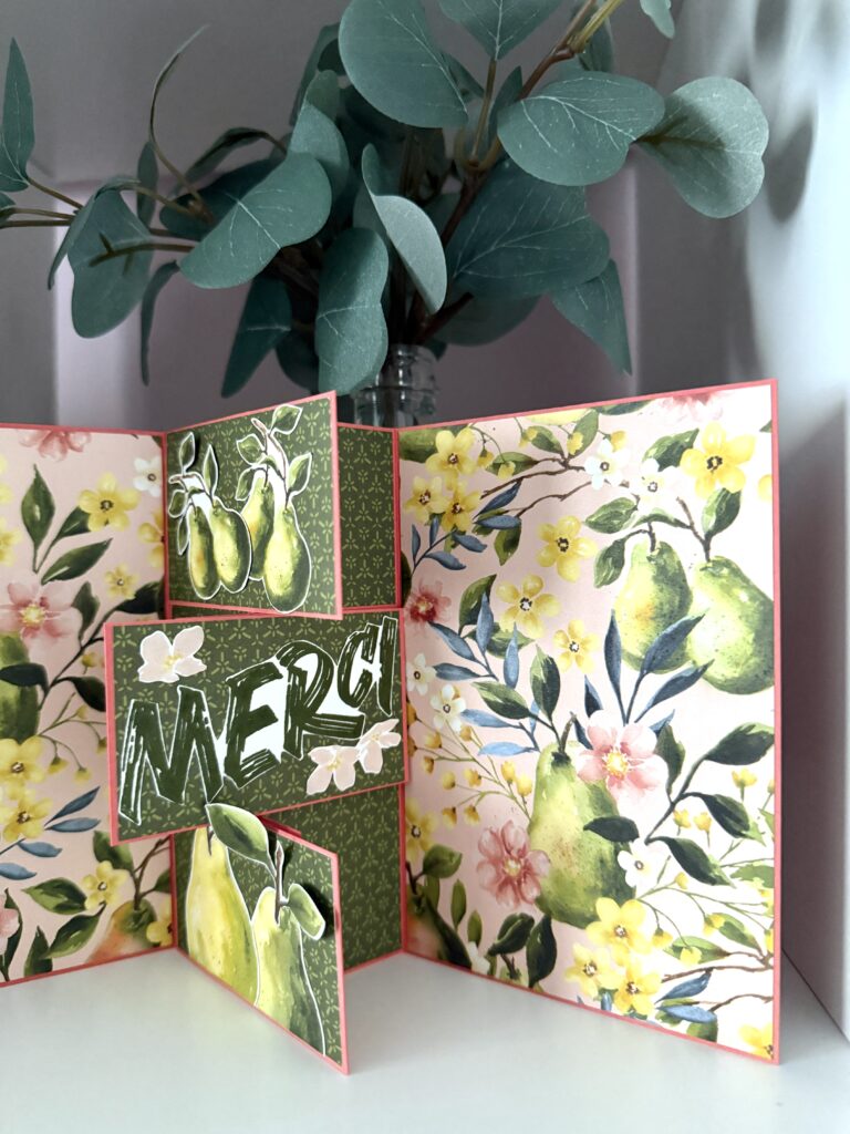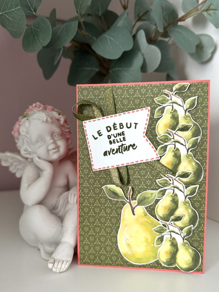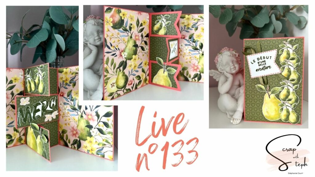 Avant de commencer le live, je vous ai montré une première version de cette carte, réalisée avec la collection de papiers “Poires Paisibles”. Cette collection respire la douceur, avec ses couleurs tendres et ses motifs délicats. Elle se prête merveilleusement bien aux cartes d’amitié, aux anniversaires ou encore aux félicitations, en fait elle est parfaite pour toutes les occasions Hihihiiiiiiiiiii.