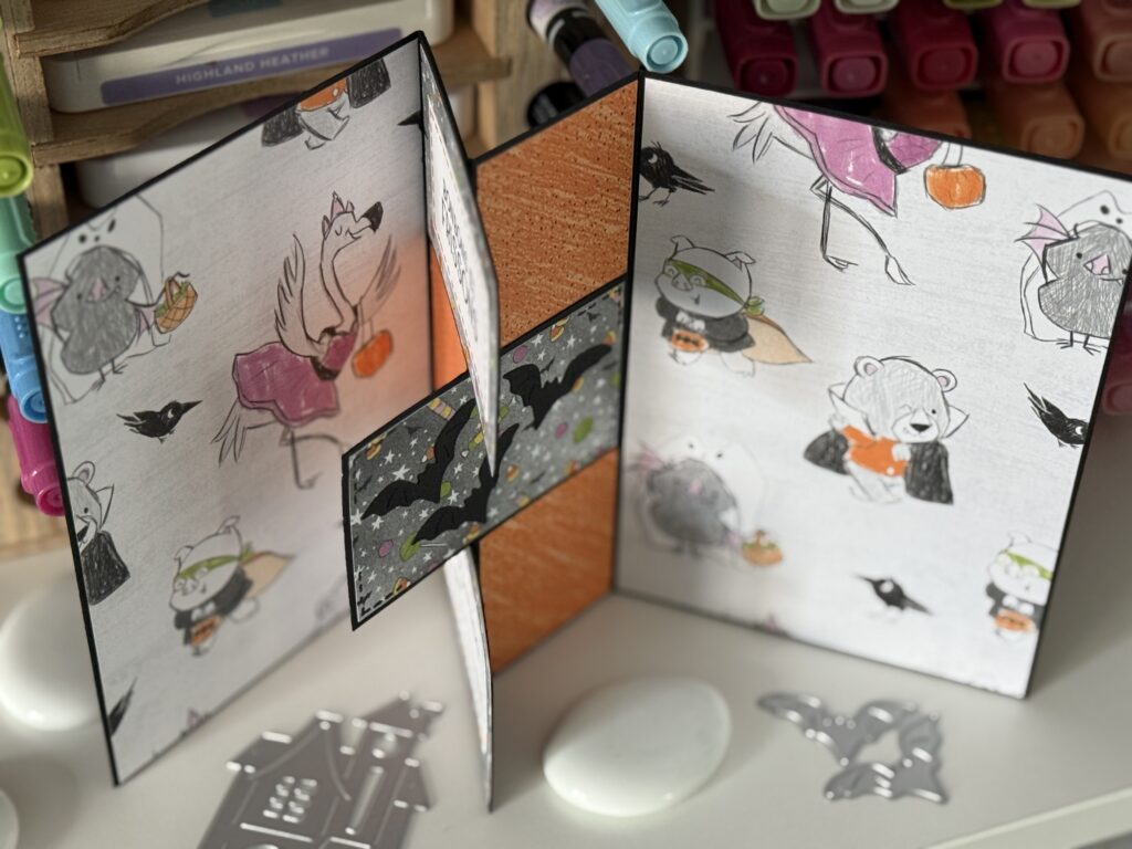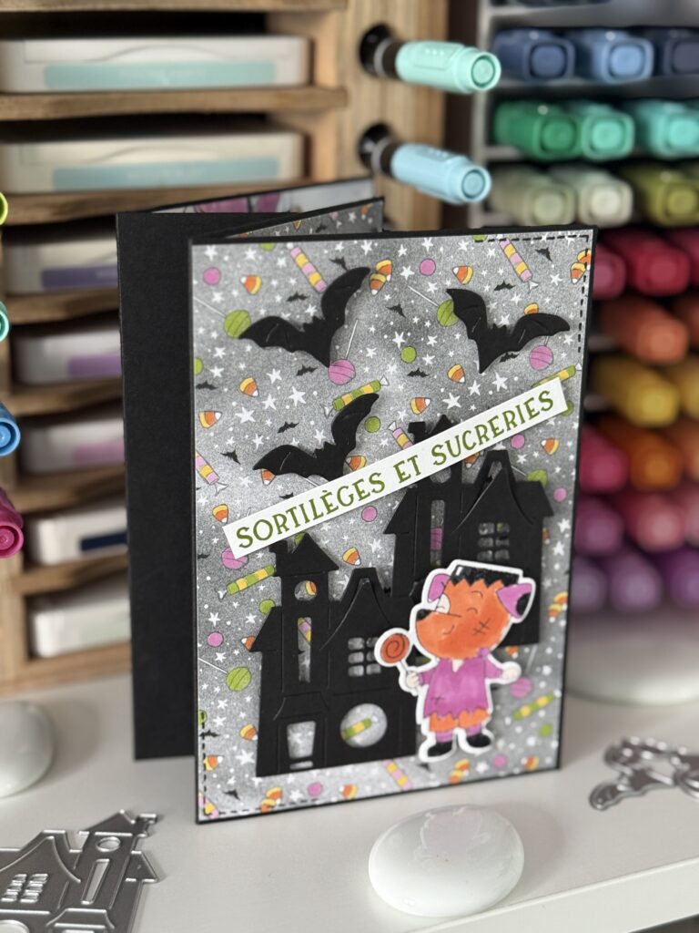 J’ai sorti ma collection de papier “Même, pas peur”, parfaite pour la saison avec ses couleurs acidulées, et j’y ai associé le lot tampons et poinçons “Délices et Frissons”. Ce set est un vrai coup de cœur : de petites chauves-souris toutes mignonnes, des citrouilles rigolotes, des petites étiquettes idéales pour agrémenter cartes, sachets de bonbons ou petites surprises pour les enfants à Halloween.