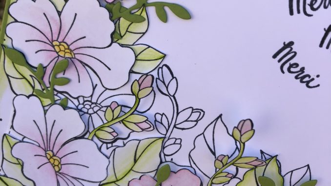 Voilà un petit méli-mélo de fleurs tamponnées directement sur le fond de carte et d’autres rajoutées en volume après avoir été colonisées et mêlées à des petits feuillages