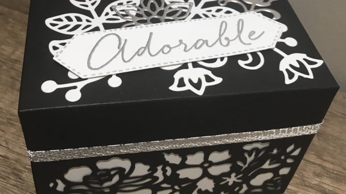 Il s’agit d’une boite, j’adore les boites, confectionnée pour offrir un petit cadeau puisqu’elle fait 10,5 x 6,5 x 7,5 cm de hauteur et cette boite a une parois double ce qui permet d’utiliser un die très découpé mais d’avoir une boite à parois pleine