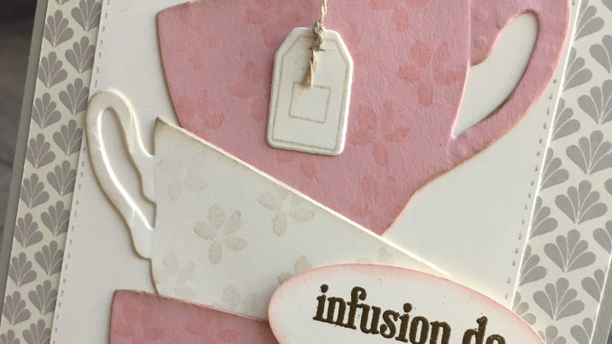 On se retrouve aujourd’hui pour que je vous montre un autre modèle de carte sur ma thématique du moment, il s’agit du set de tampons « Petite tasse » coordonné aux framelits « L’heure du thé », il ne peut pas être utilisé en toute circonstance mais il est vraiment choupi