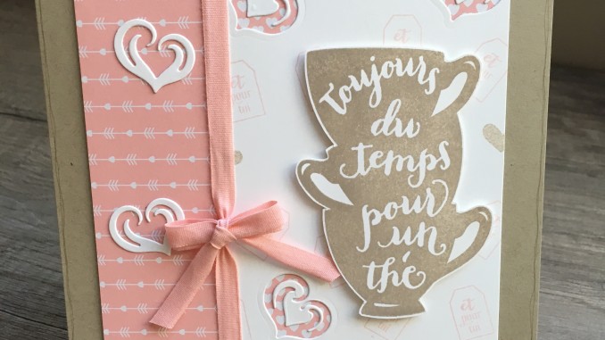 Je me suis attachée cette fois à travailler avec le set de tampons « Petite tasse » coordonné aux framelits « L’heure du thé ». Je me dis souvent qu’il y a trop de choses que je n’utilise pas correctement dans un catalogue alors une de mes résolutions était de pallier à ça !