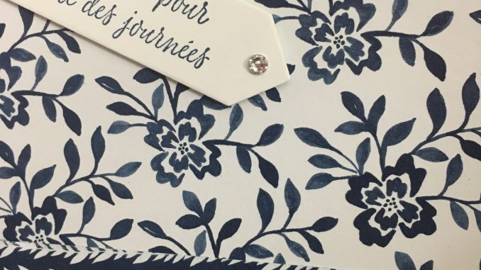 Je cherchais un modèle de carte simple mais wahoo et je l’ai trouvé sur le blog de Marika Lemay « La magie des étampes », il me restait à utiliser notre papier « Boutique fleurie » sur une base « Bleu nuit » pour obtenir une carte plutôt chic, je trouve. Notre perfo « Trois fleurs » m’a bien aidé ainsi que le set de tampons « Médaillons glacés »